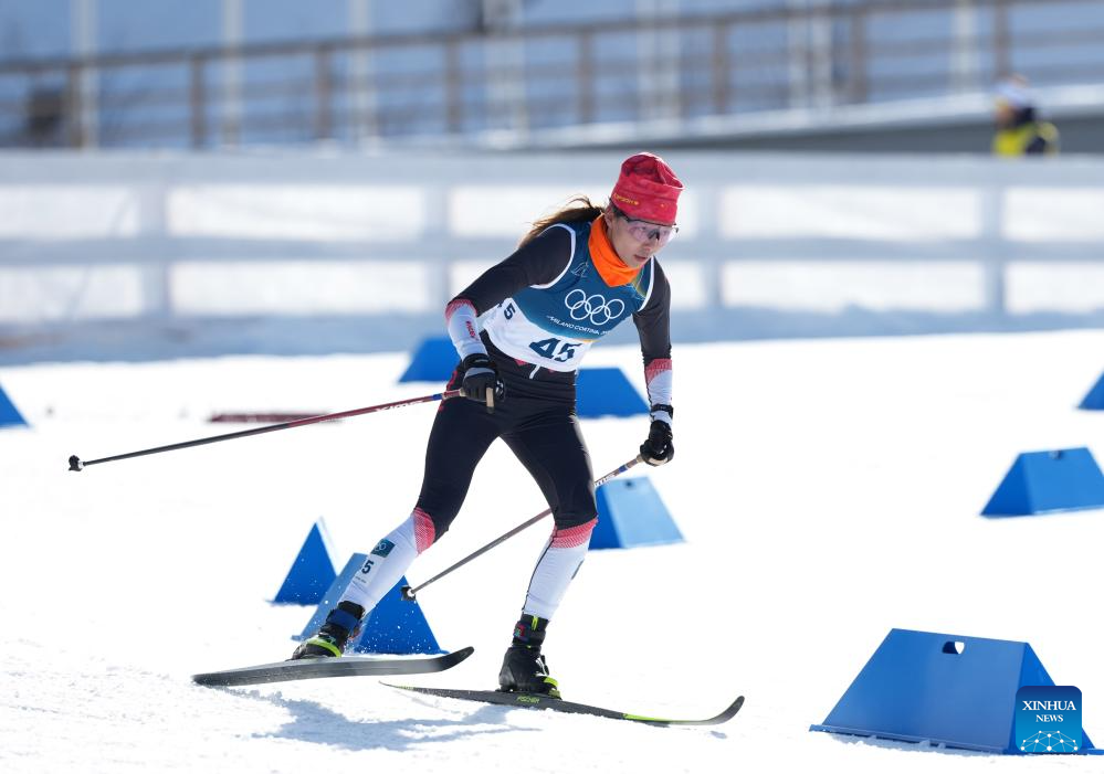 Dinigeer Yilamujiang of China competes during the cross-country skiing women's 50km mass start classic match at the Milan-Cortina 2026 Olympic Winter Games in Tesero, Italy, Feb. 22, 2026. (Xinhua/He Canling)