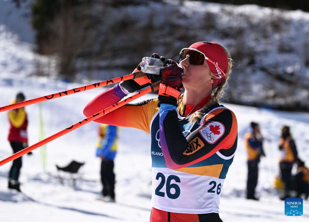 Sonjaa Schmidt of Canada hydrates during the cross-country skiing women's 50km mass start classic match at the Milan-Cortina 2026 Olympic Winter Games in Tesero, Italy, Feb. 22, 2026. (Xinhua/He Canling)