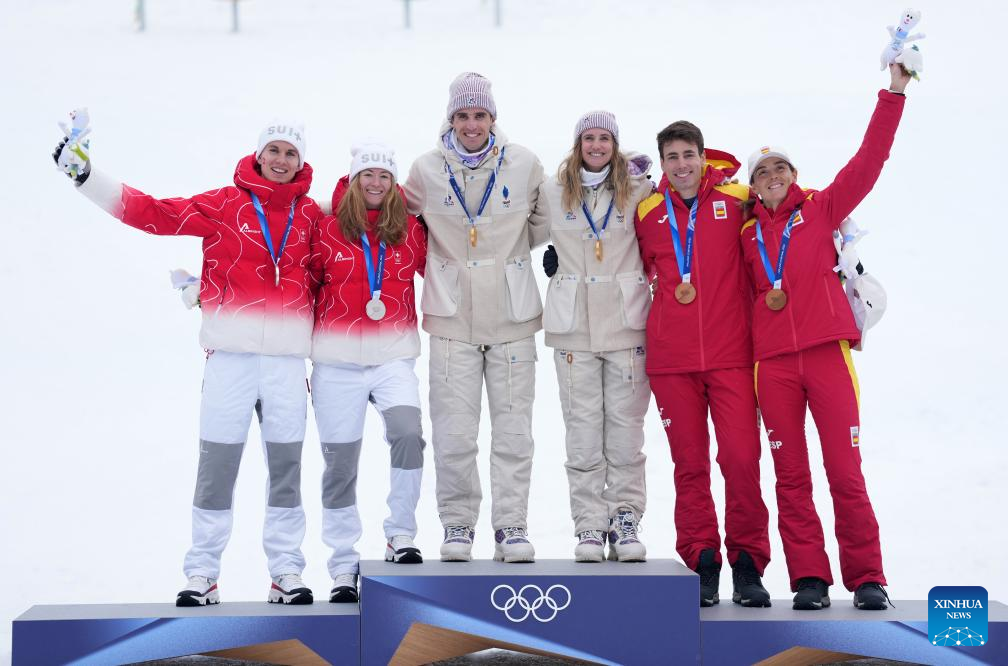 Silver medalists Jon Kistler (1st, L) and Marianne Fatton (2nd, L) of Switzerland, gold medalists Thibault Anselmet (3rd, L) and Emily Harrop (3rd, R) of France, bronze medalists Oriol Cardona Coll (2nd, R) and Ana Alonso Rodriguez (1st, R) of Spain pose during the awarding ceremony for ski mountaineering mixed relay event at the Milan-Cortina 2026 Olympic Winter Games in Bormio, Italy, Feb. 21, 2026. (Xinhua/Hu Huhu)