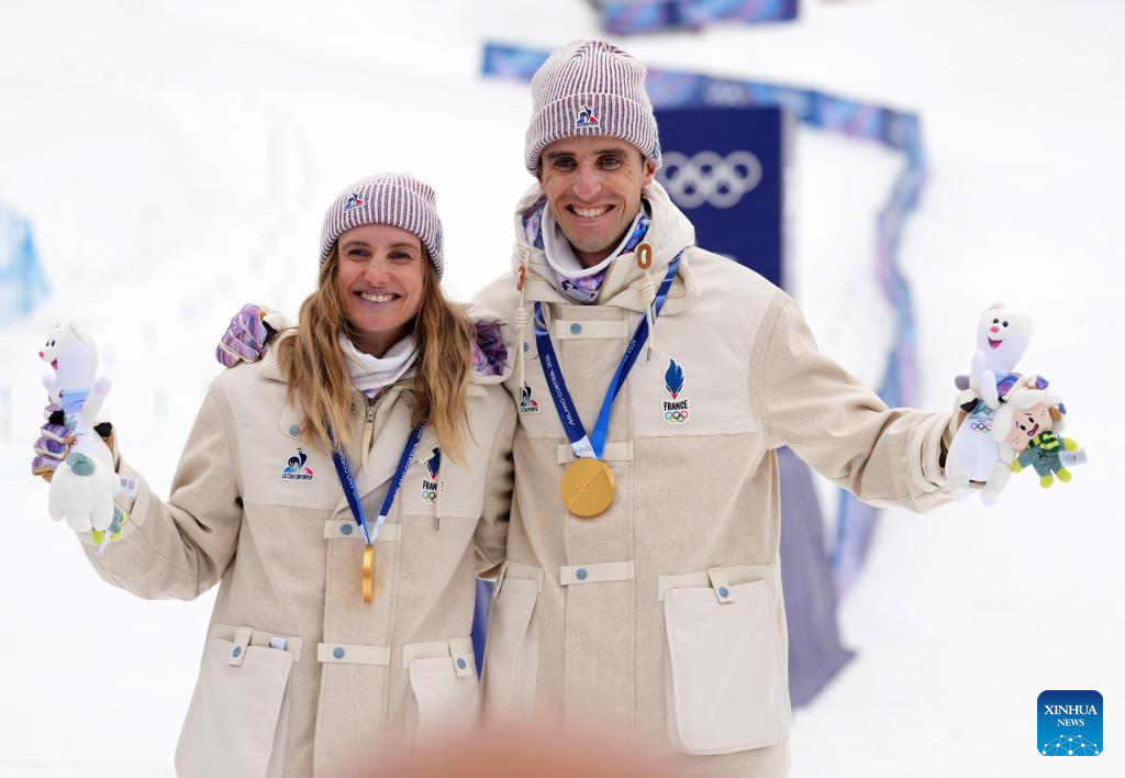 Gold medalists Thibault Anselmet (R) and Emily Harrop of France pose during the awarding ceremony for ski mountaineering mixed relay event at the Milan-Cortina 2026 Olympic Winter Games in Bormio, Italy, Feb. 21, 2026. (Xinhua/Hu Huhu)