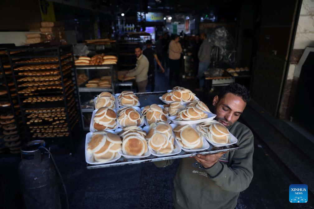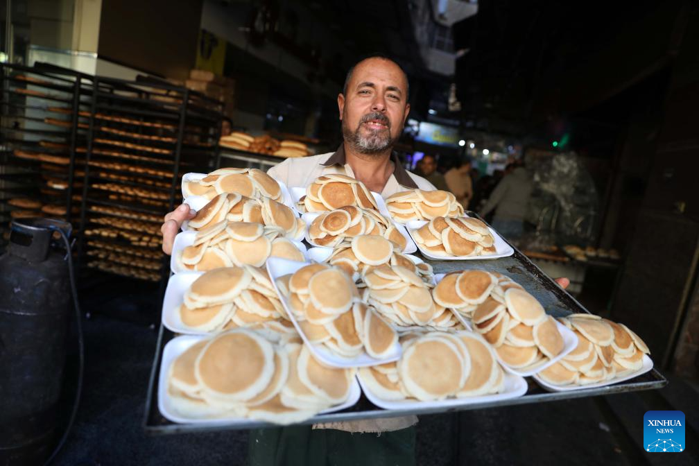 A baker carries traditional sweets known as "Qatayef" for sale during the holy month of Ramadan in Cairo, Egypt, on Feb. 21, 2026. Egyptians eat traditional sweets during Ramadan to break their fast. (Xinhua/Ahmed Gomaa)