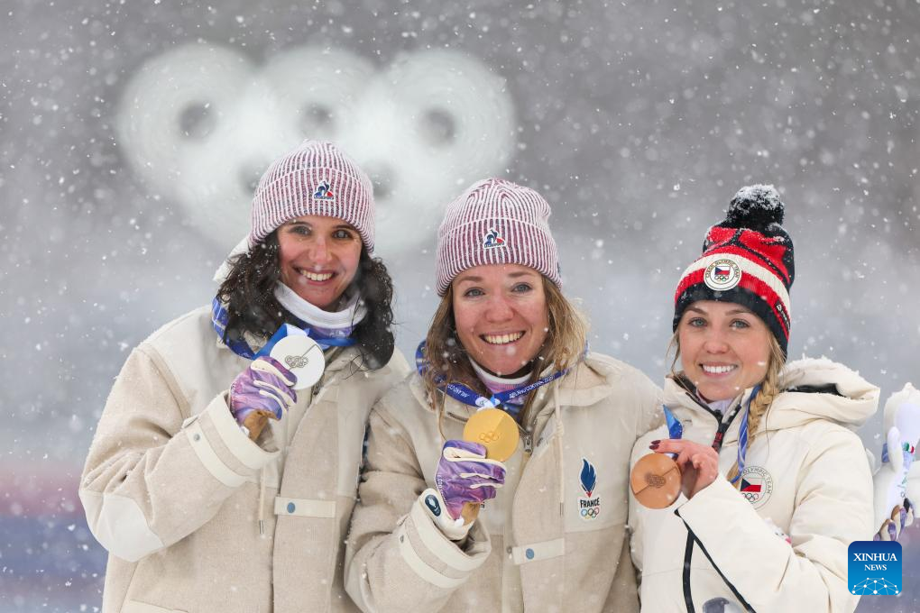 Oceane Michelon (C) of France celebrates during the awarding ceremony of the biathlon women's 12.5km mass start event at the 2026 Milan-Cortina Winter Olympics in Anterselva, Italy, Feb. 21, 2026. (Xinhua/Zhang Tao)