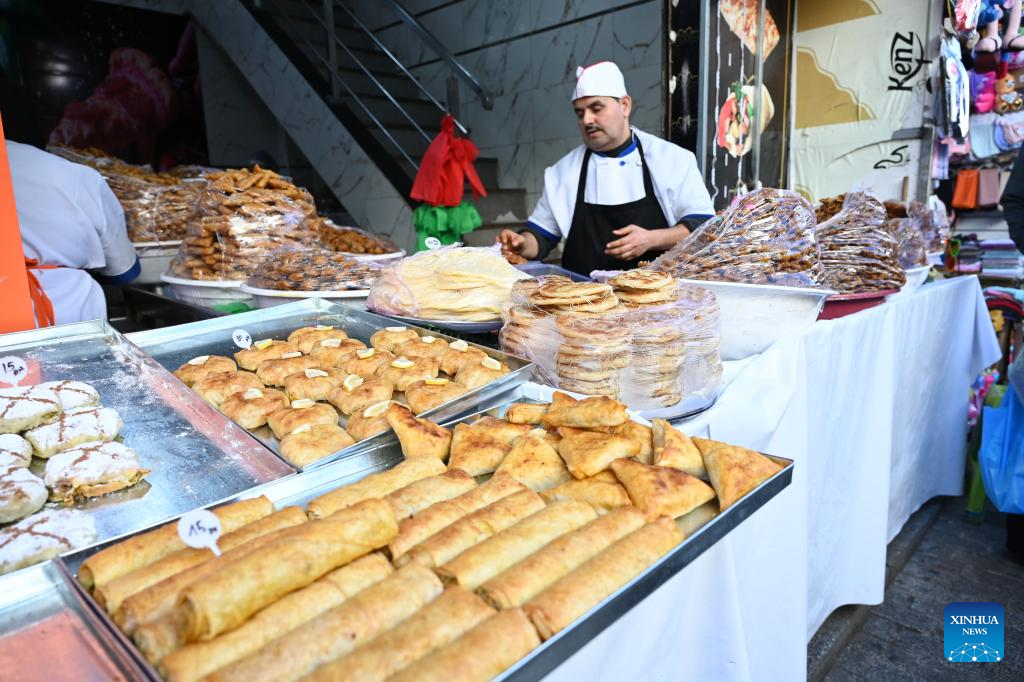 A vendor sells traditional Moroccan pastries at a market during the Muslim holy month of Ramadan in Rabat, Morocco, on Feb. 21, 2026. (Photo by Aissa/Xinhua)