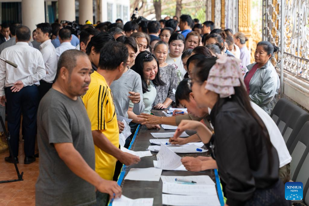 Citizens register and collect ballots at a polling station in Vientiane, Laos, Feb. 22, 2026. Voting began at 7:00 a.m. local time (0000 GMT) on Sunday for the election of members of the Lao National Assembly's 10th legislature and the fifth Provincial People's Councils in Laos. (Photo by Kaikeo Saiyasane/Xinhua)
