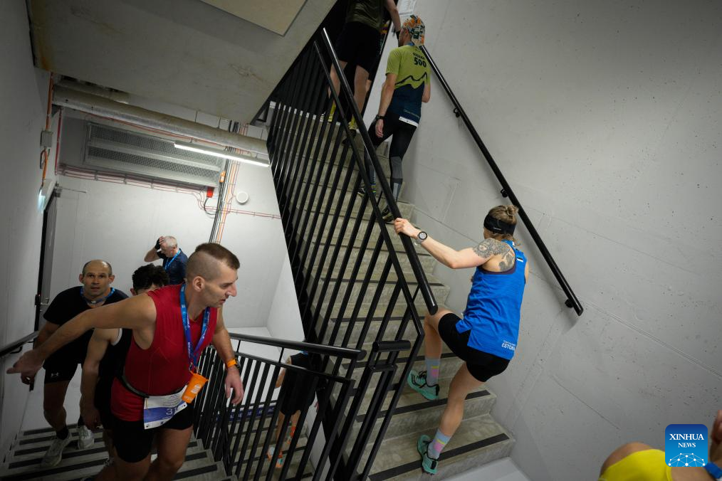 Participants climb the stairs inside the Skyliner building during the Skyliner Everest Run 2026 in Warsaw, Poland on Feb. 21, 2026. The event requires competitors to ascend the 42-floor staircase 55 times within 24 hours, reaching a cumulative height equivalent to the world's highest peak, Mount Qomolangma. (Photo by Jaap Arriens/Xinhua)