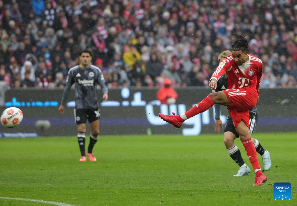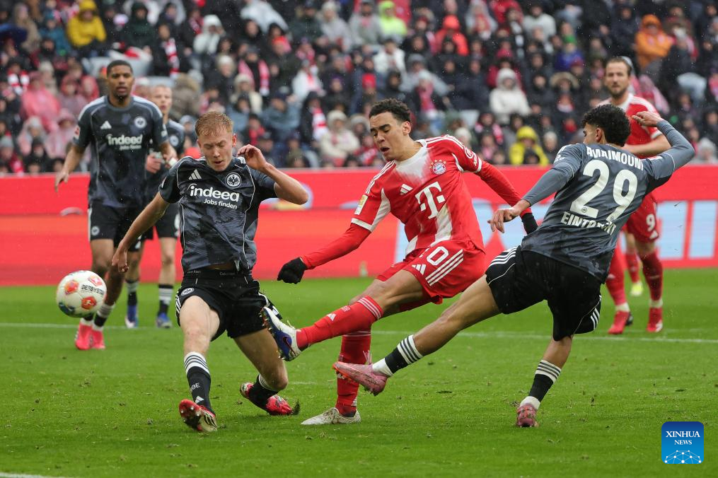 BERLIN, Feb. 21 (Xinhua) -- FC Bayern Munich survived a tense finish to secure a 3-2 home win over Eintracht Frankfurt and maintains its lead at the top of the Bundesliga on Saturday.