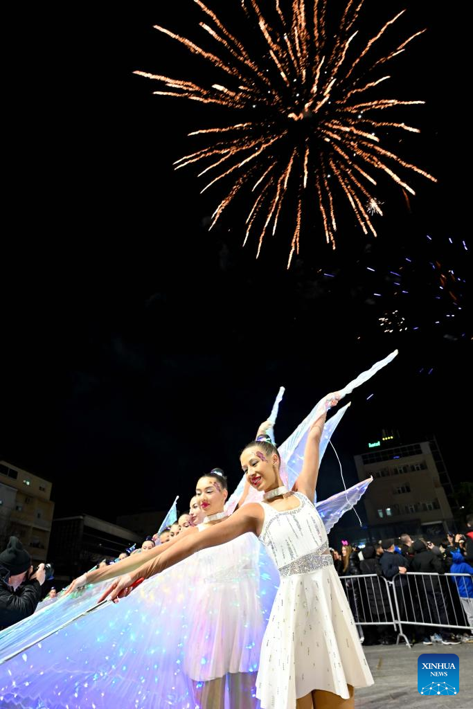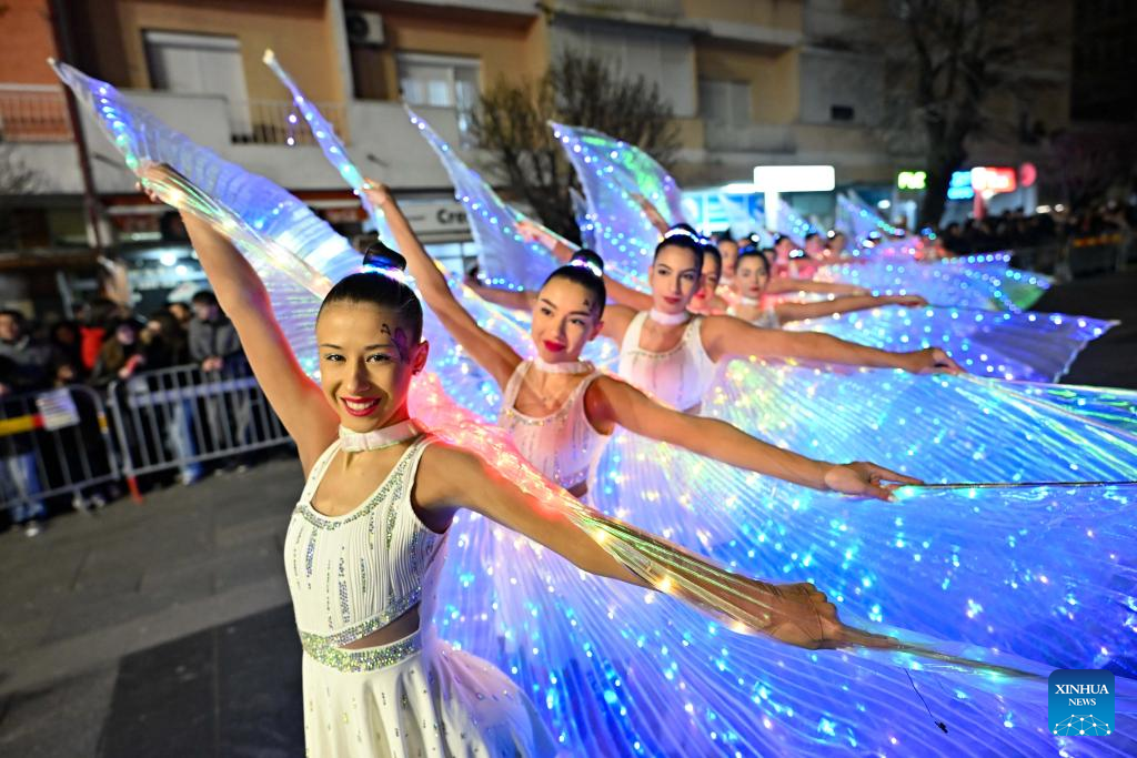 Costumed revelers perform in an evening carnival in Strumica, North Macedonia, Feb. 21, 2026. (Photo by Tomislav Georgiev/Xinhua)