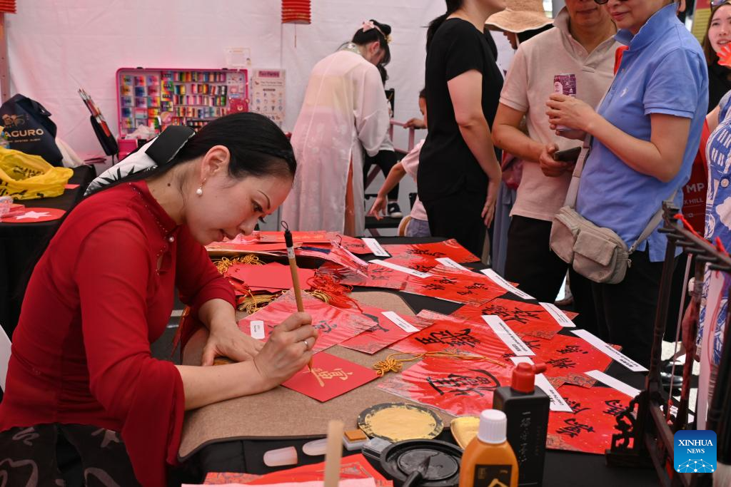 A calligrapher writes diamond-shaped blessing posters for people at a Chinese New Year celebration event in Melbourne, Australia, Feb. 21, 2026. (Xinhua/Xu Haijing)