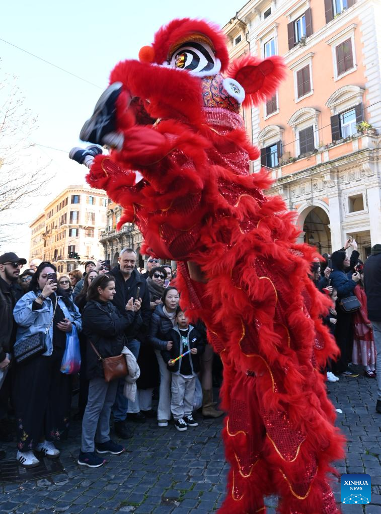 People perform lion dance during a Chinese New Year parade in Rome, Italy, Feb. 22, 2026. (Photo by Elisa Lingria/Xinhua)