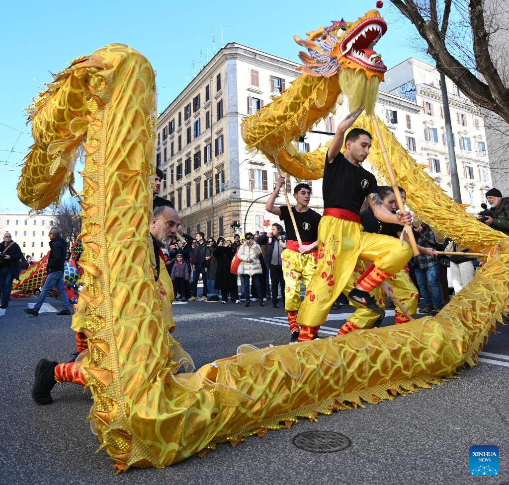 People perform dragon dance during a Chinese New Year parade in Rome, Italy, Feb. 22, 2026. (Photo by Elisa Lingria/Xinhua)