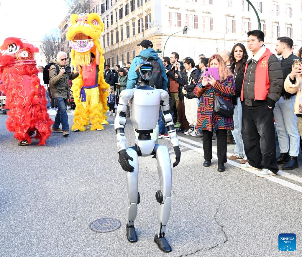 A robot performs during a Chinese New Year parade in Rome, Italy, Feb. 22, 2026. (Photo by Elisa Lingria/Xinhua)