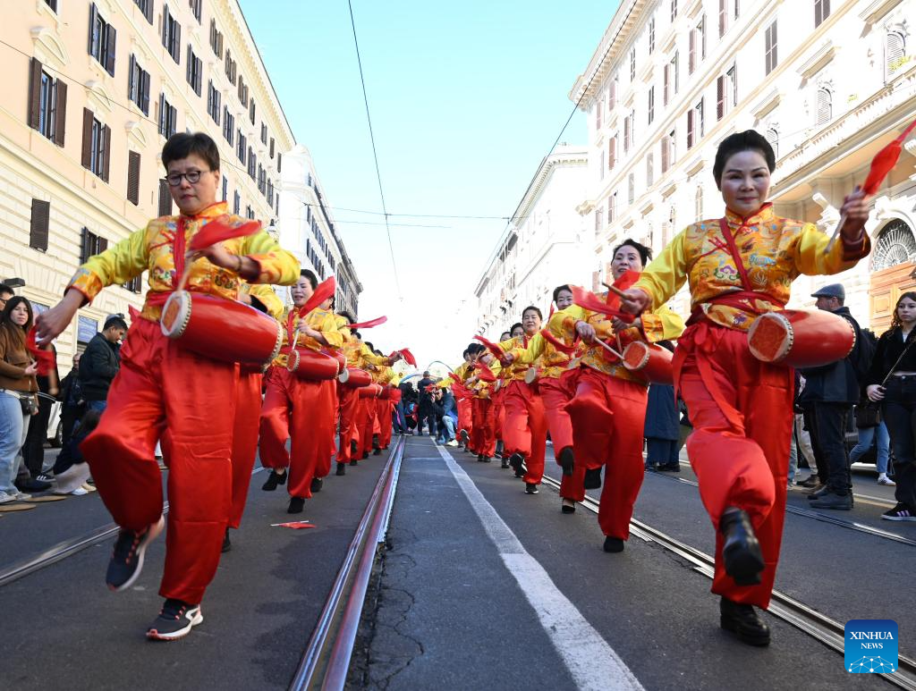 Women perform drum dance during a Chinese New Year parade in Rome, Italy, Feb. 22, 2026. (Photo by Elisa Lingria/Xinhua)