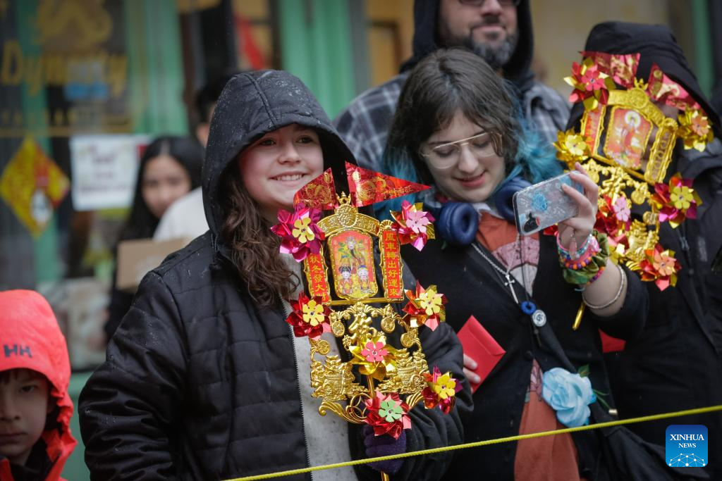 People carry Chinese New Year-themed ornaments while watching a Spring Festival parade at Chinatown in Vancouver, British Columbia, Canada, on Feb. 22, 2026. The 52nd annual Vancouver Chinatown Spring Festival Parade was held here on Sunday to celebrate the Chinese Year of the Horse. (Photo by Liang Sen/ Xinhua)