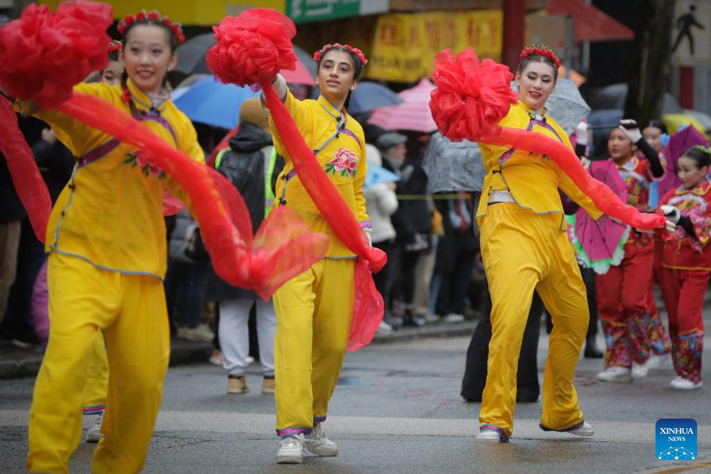 Dancers perform along the street during a Spring Festival parade at Chinatown in Vancouver, British Columbia, Canada, on Feb. 22, 2026. The 52nd annual Vancouver Chinatown Spring Festival Parade was held here on Sunday to celebrate the Chinese Year of the Horse. (Photo by Liang Sen/ Xinhua)