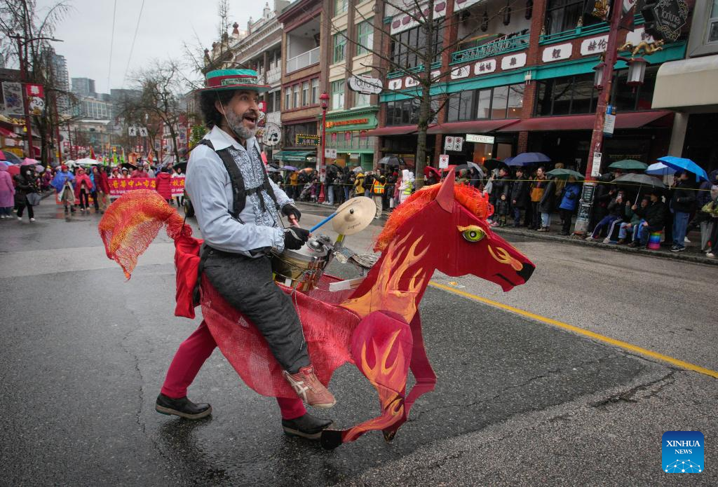 A musician in a horse-shaped costume performs during a Spring Festival parade at Chinatown in Vancouver, British Columbia, Canada, on Feb. 22, 2026. The 52nd annual Vancouver Chinatown Spring Festival Parade was held here on Sunday to celebrate the Chinese Year of the Horse. (Photo by Liang Sen/ Xinhua)