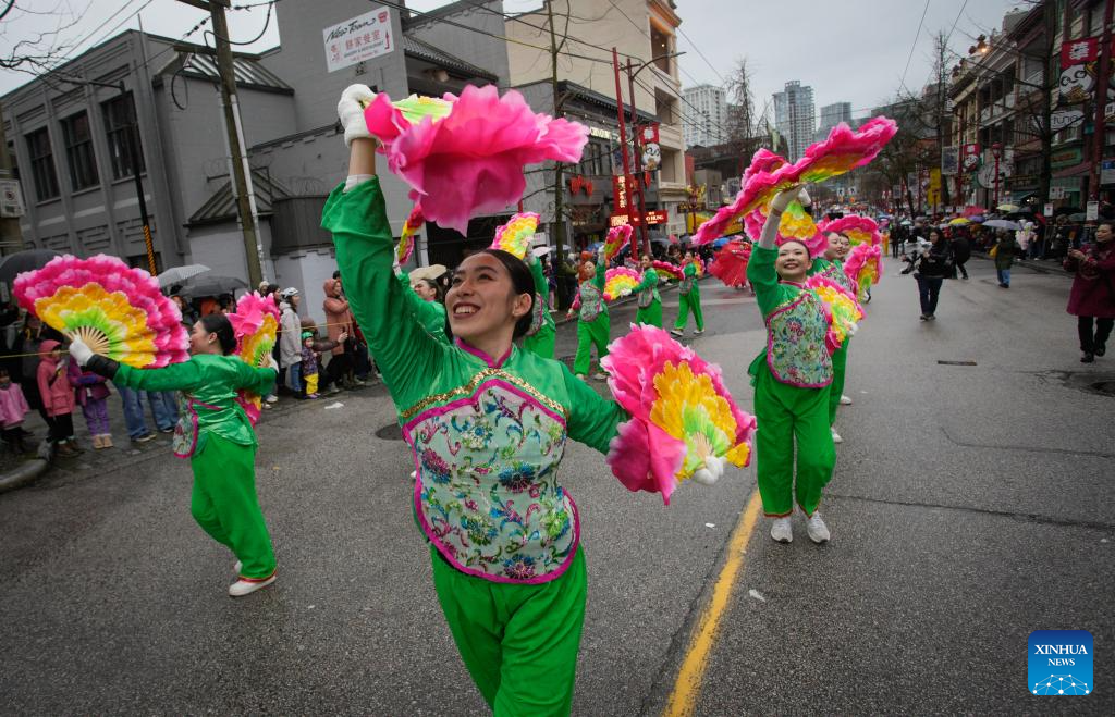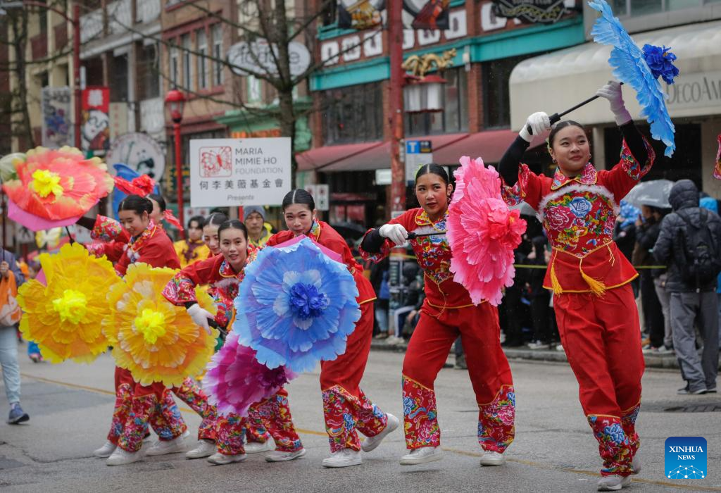 Performers march along the street during a Spring Festival parade at Chinatown in Vancouver, British Columbia, Canada, on Feb. 22, 2026. The 52nd annual Vancouver Chinatown Spring Festival Parade was held here on Sunday to celebrate the Chinese Year of the Horse. (Photo by Liang Sen/ Xinhua)