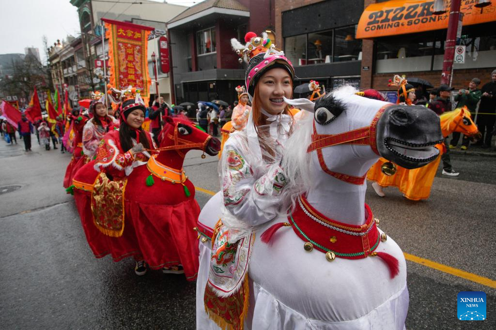 Performers in horse-shaped costumes march through the street during a Spring Festival parade at Chinatown in Vancouver, British Columbia, Canada, on Feb. 22, 2026. The 52nd annual Vancouver Chinatown Spring Festival Parade was held here on Sunday to celebrate the Chinese Year of the Horse. (Photo by Liang Sen/ Xinhua)