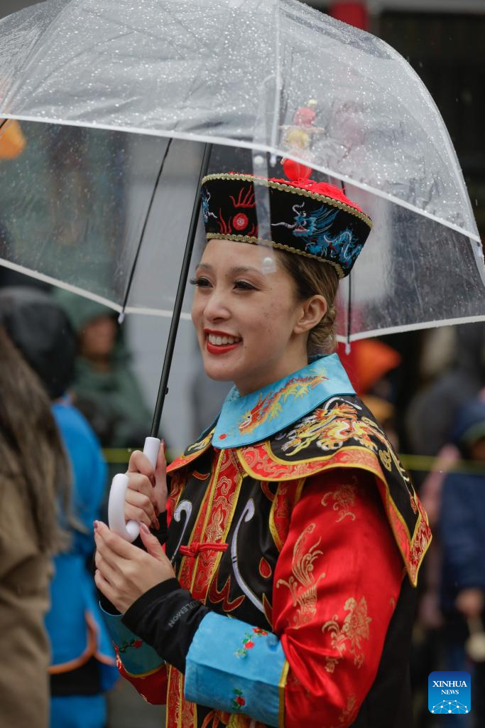 A woman in a traditional Chinese costume takes part in a Spring Festival parade at Chinatown in Vancouver, British Columbia, Canada, on Feb. 22, 2026. The 52nd annual Vancouver Chinatown Spring Festival Parade was held here on Sunday to celebrate the Chinese Year of the Horse. (Photo by Liang Sen/ Xinhua)