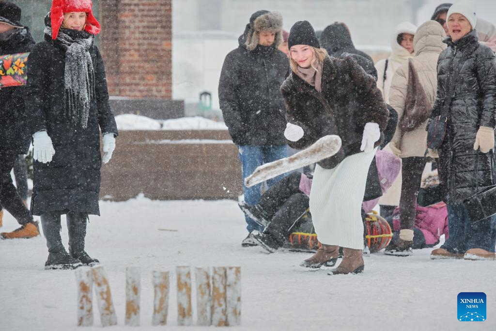 People play a traditional game during Maslenitsa celebrations in St. Petersburg, Russia, on Feb. 22, 2026. Various events were held in St. Petersburg on Sunday to celebrate the traditional festival Maslenitsa. During the festival, people took part in a wide range of activities to bid farewell to the cold winter and welcome the arrival of spring. (Photo by Irina Motina/Xinhua)