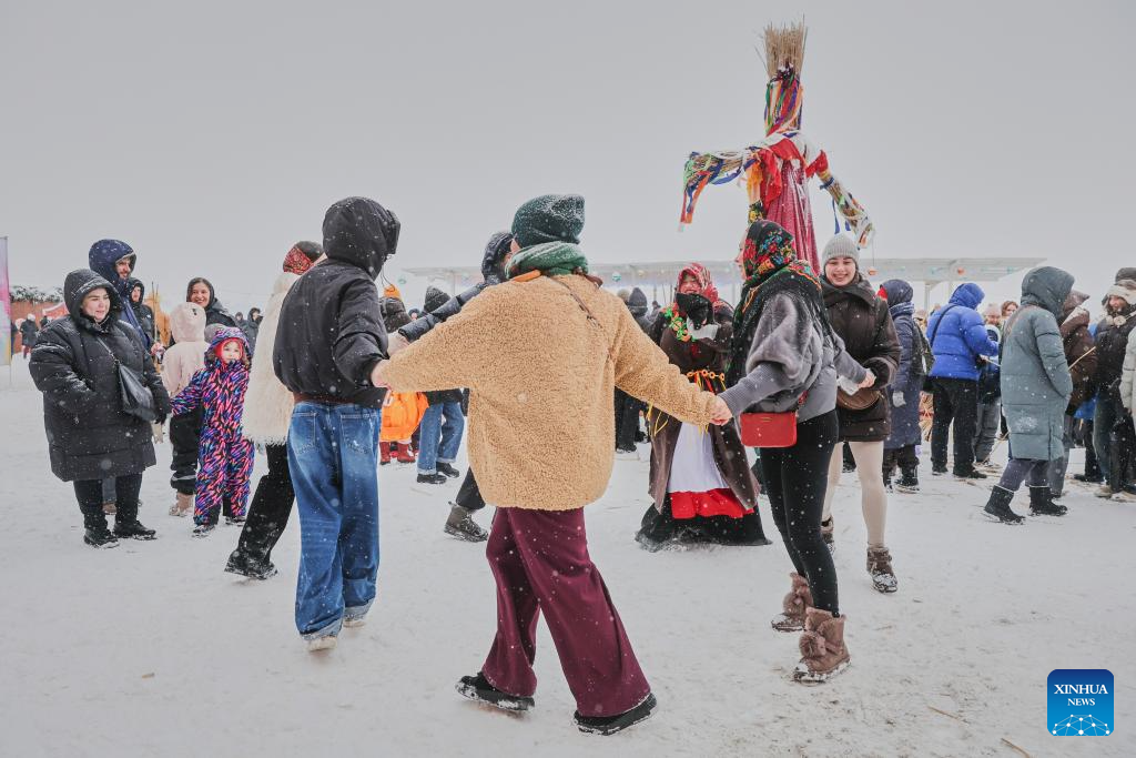 People participate in a traditional circle dance during Maslenitsa celebrations in St. Petersburg, Russia, on Feb. 22, 2026. Various events were held in St. Petersburg on Sunday to celebrate the traditional festival Maslenitsa. During the festival, people took part in a wide range of activities to bid farewell to the cold winter and welcome the arrival of spring. (Photo by Irina Motina/Xinhua)