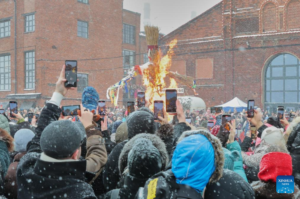 People watch the straw figure burning during Maslenitsa celebrations in St. Petersburg, Russia, on Feb. 22, 2026. Various events were held in St. Petersburg on Sunday to celebrate the traditional festival Maslenitsa. During the festival, people took part in a wide range of activities to bid farewell to the cold winter and welcome the arrival of spring. (Photo by Irina Motina/Xinhua)