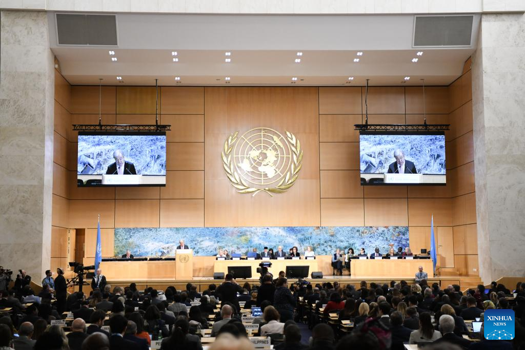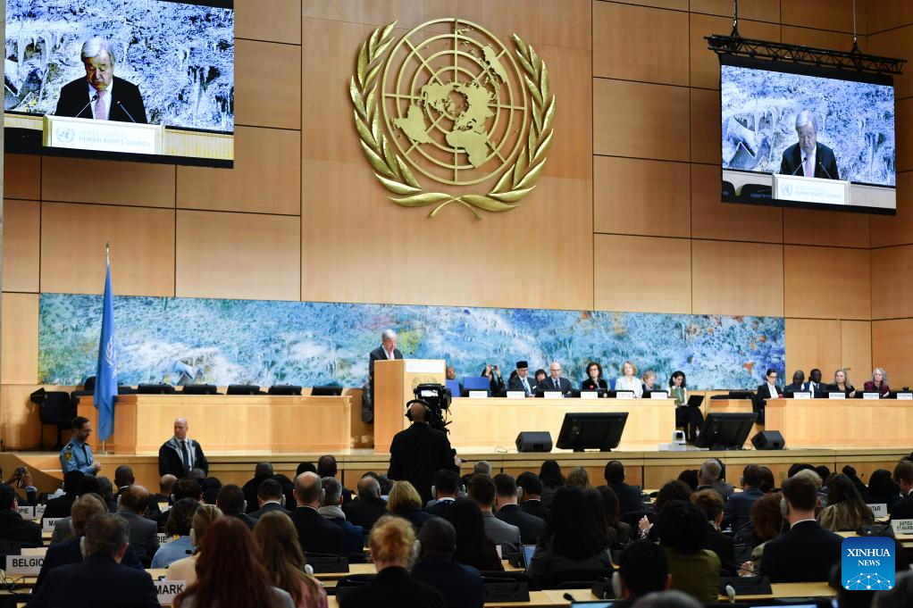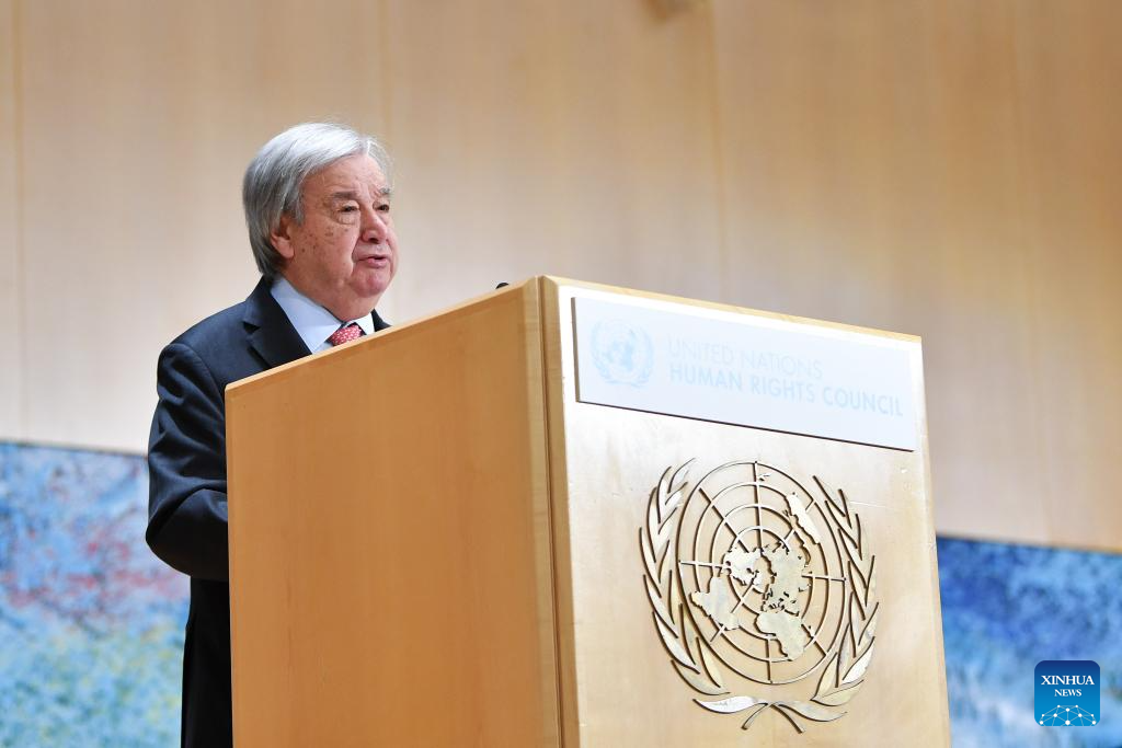 United Nations (UN) Secretary-General Antonio Guterres addresses the 61st session of the UN Human Rights Council at Palais des Nations in Geneva, Switzerland, Feb. 23, 2026. United Nations (UN) Secretary-General Antonio Guterres said on Monday that human rights, human dignity, and international law are being blatantly violated in areas affected by the Palestine-Israel conflict, and the two-state solution is "being stripped away." (Xinhua/Lian Yi)
