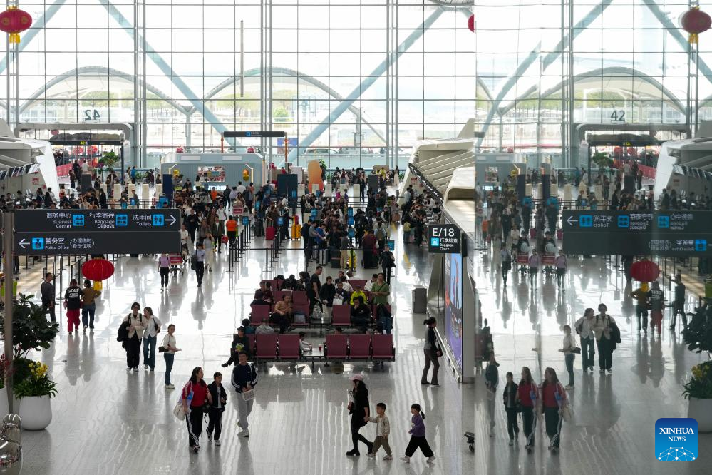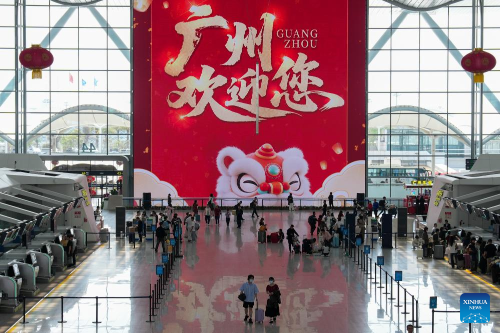 This photo taken on Feb. 23, 2026 shows passengers at Terminal 2 of Guangzhou Baiyun International Airport in Guangzhou, south China's Guangdong Province. According to official data, Guangzhou Baiyun International Airport has handled a cumulative total of 5.2785 million passengers since the Spring Festival travel rush began on Feb.2, 2026. (Xinhua/Wu Lu)