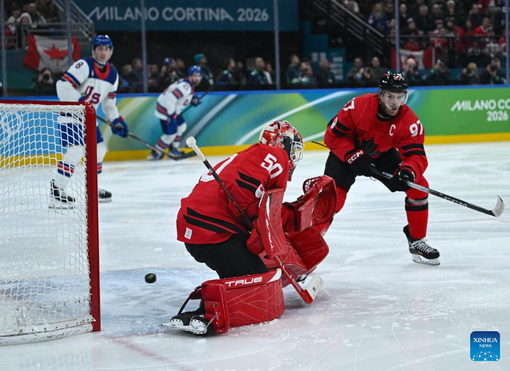 Players compete during the ice hockey men's gold medal game between Canada and the United States at the Milan-Cortina 2026 Olympic Winter Games in Milan, Italy, Feb. 22, 2026. (Xinhua/Tao Xiyi)