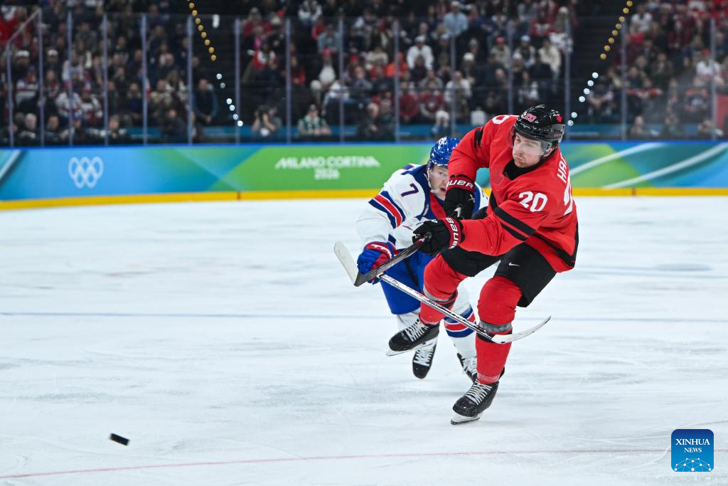 Thomas Harley of Canada shoots during the ice hockey men's gold medal game between Canada and the United States at the Milan-Cortina 2026 Olympic Winter Games in Milan, Italy, Feb. 22, 2026. (Xinhua/Zhang Haofu)