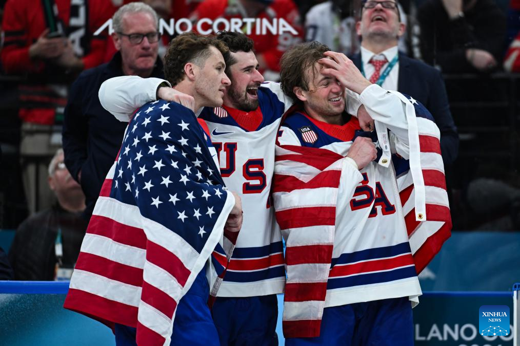 Players of the United States celebrate after the ice hockey men's gold medal game between Canada and the United States at the Milan-Cortina 2026 Olympic Winter Games in Milan, Italy, Feb. 22, 2026. (Xinhua/Tao Xiyi)