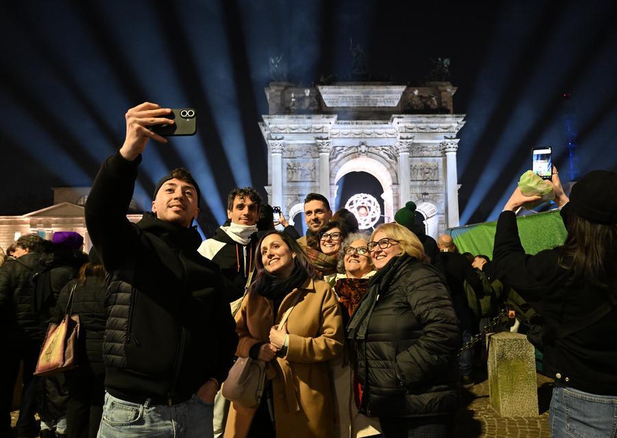 ↑People pose for photos in front of the cauldron of the Milan-Cortina 2026 Olympic Winter Games in Milan, Italy, Feb. 22, 2026. (Xinhua/Wu Wei)
