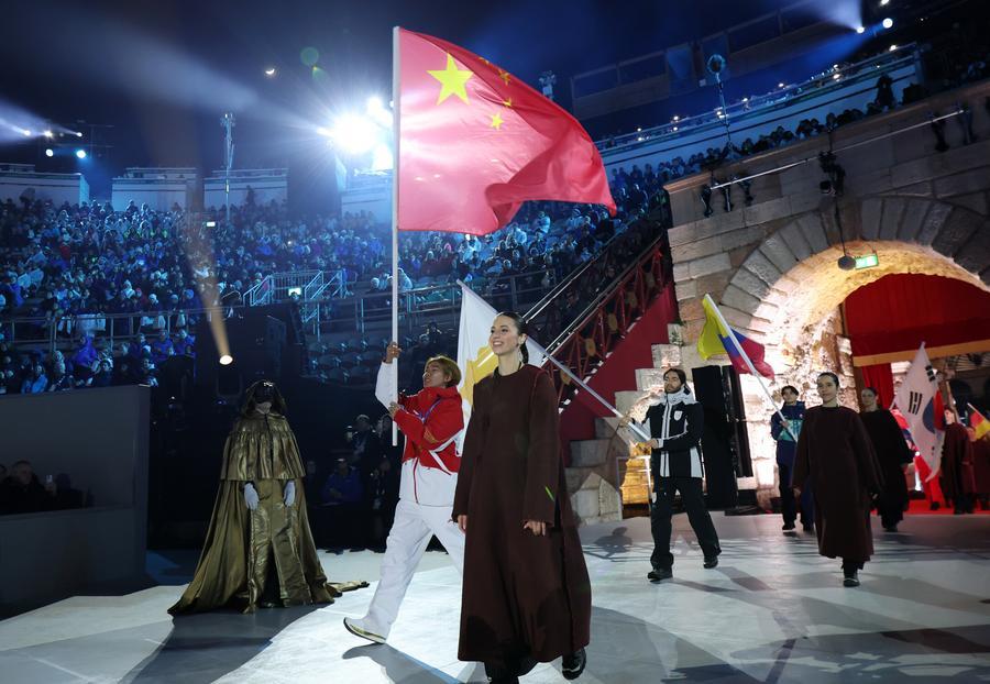 ↑Su Yiming, flag bearer of the delegation of China, parades during the closing ceremony of the Milan-Cortina 2026 Olympic Winter Games at Verona Olympic Arena in Verona, Italy, Feb. 22, 2026. (Xinhua/Li Ming)