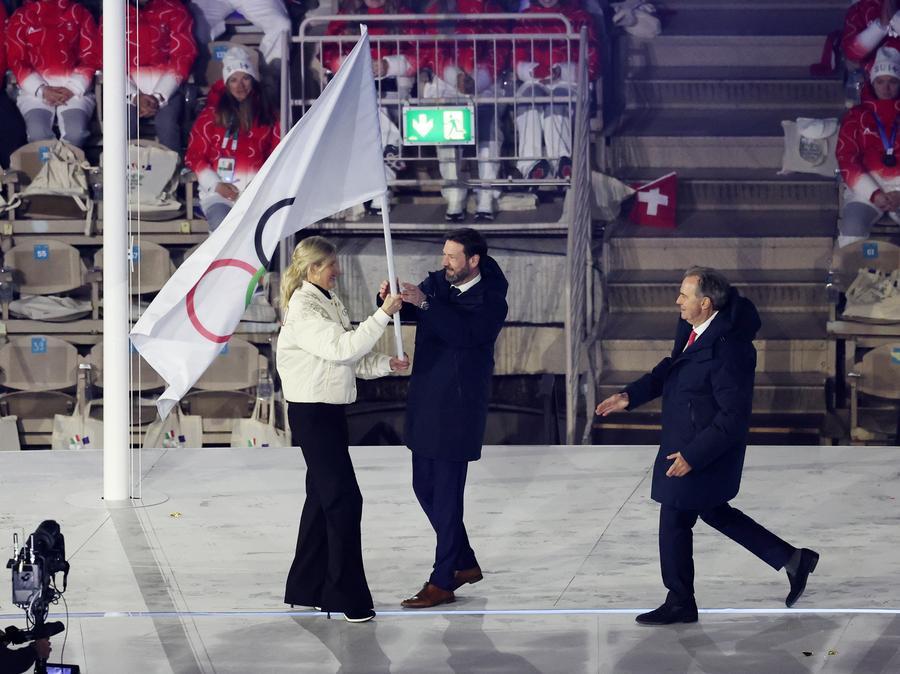 ↑This photo taken on Feb. 22, 2026 shows the handover of the Olympic flag during the closing ceremony of the Milan-Cortina 2026 Olympic Winter Games at Verona Olympic Arena in Verona, Italy. (Xinhua/Li Jing)