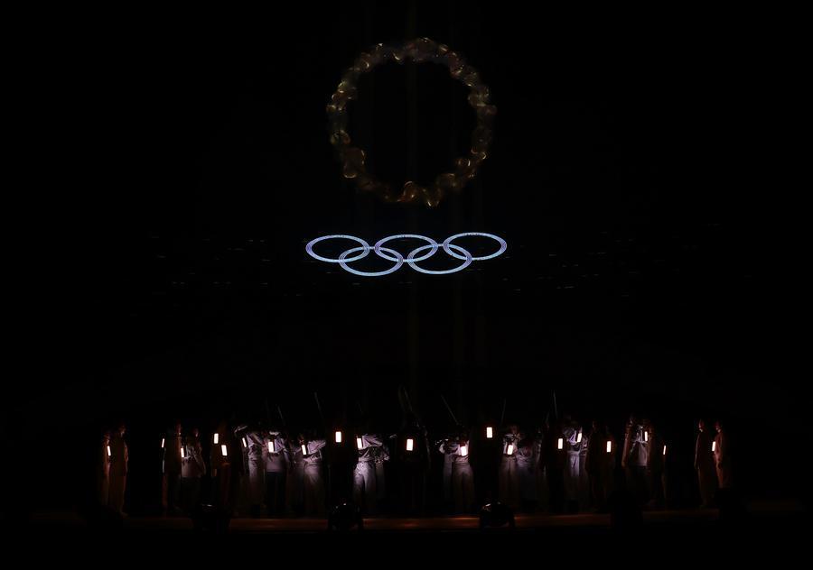 ↑This photo taken on Feb. 22, 2026 shows the Olympic Rings during the closing ceremony of the Milan-Cortina 2026 Olympic Winter Games at Verona Olympic Arena in Verona, Italy. (Xinhua/Li Ming)
