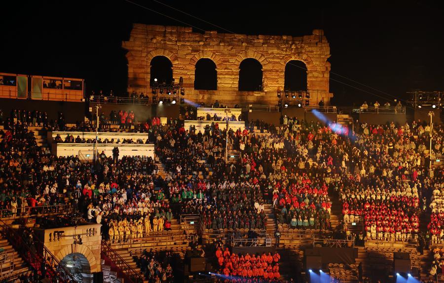 ↑This photo taken on Feb. 22, 2026 shows the closing ceremony of the Milan-Cortina 2026 Olympic Winter Games at Verona Olympic Arena in Verona, Italy. (Xinhua/Wang Kaiyan)