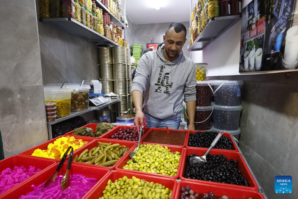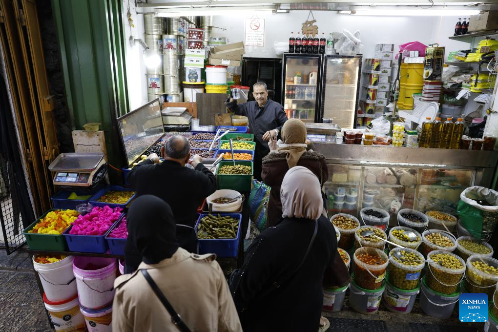 People shop for a variety of pickles during the holy month of Ramadan in the Old City of Jerusalem, Feb. 22, 2026. (Photo by Jamal Awad/Xinhua)