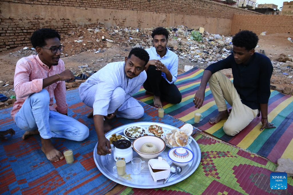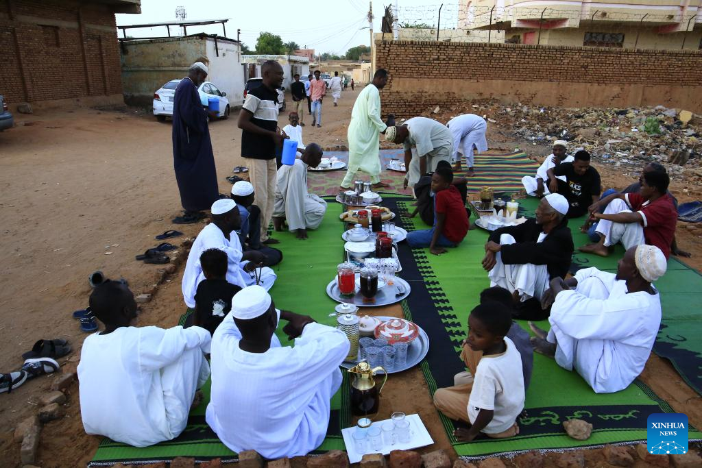 Photo taken on Feb. 23, 2026 shows residents sitting on mats waiting for the Maghrib call to prayer to break their fast, at Al-Hattana neighborhood of Omdurman, north of the Sudanese capital Khartoum. (Photo by Mohamed Khidir/ Xinhua)