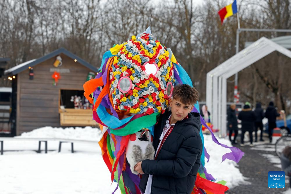 A man carries his mask during the annual "Cuckoo's Day" (Ziua Cucilor) festival in Branesti, near Bucharest, capital of Romania, on Feb. 23, 2026. Groups of masked people took part in the traditional festival, singing and dancing for good health and fertility at the beginning of spring. (Photo by Cristian Cristel/Xinhua)