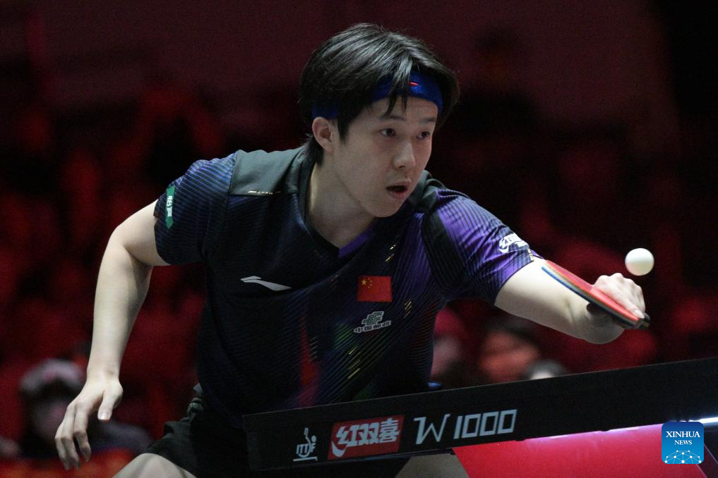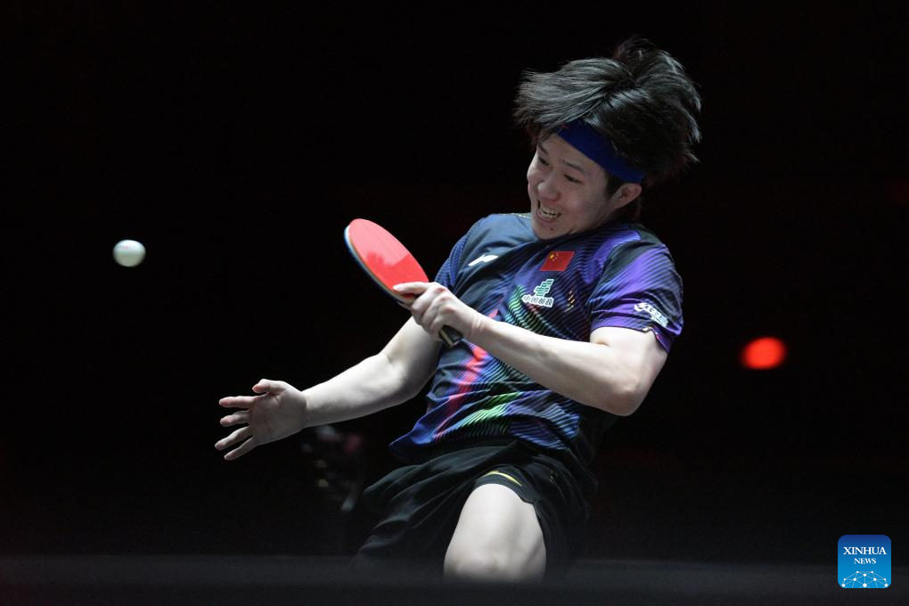 Wang Chuqin of China hits a return during the men's singles round of 32 match between Wang Chuqin of China and Togami Shunsuke of Japan at the World Table Tennis (WTT) Singapore Smash 2026 in Singapore on Feb. 24, 2026. (Photo by Then Chih Wey/Xinhua)