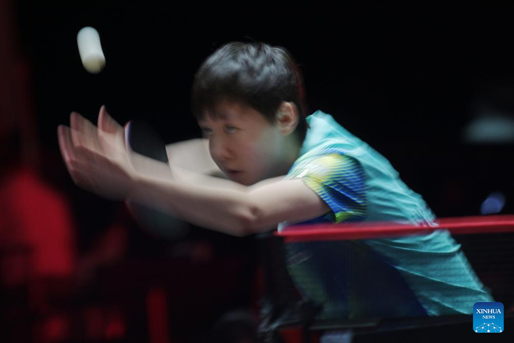 Cheng I-Ching of Chinese Taipei hits a return during the women's singles round of 32 match between Wang Manyu of China and Cheng I-Ching of Chinese Taipei at the World Table Tennis (WTT) Singapore Smash 2026 in Singapore on Feb. 24, 2026. (Photo by Then Chih Wey/Xinhua)