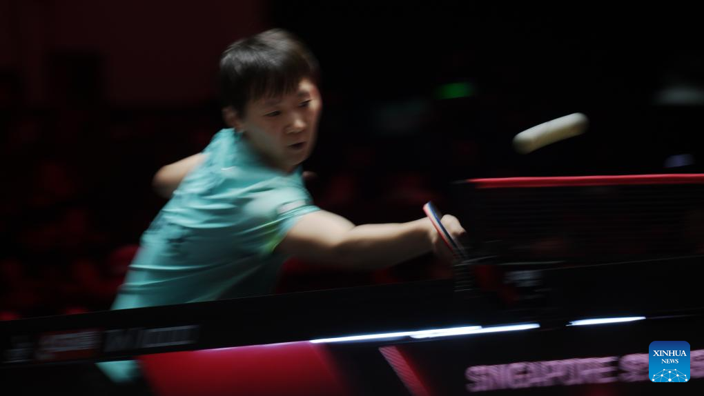 Wang Manyu of China hits a return during the women's singles round of 32 match between Wang Manyu of China and Cheng I-Ching of Chinese Taipei at the World Table Tennis (WTT) Singapore Smash 2026 in Singapore on Feb. 24, 2026. (Photo by Then Chih Wey/Xinhua)