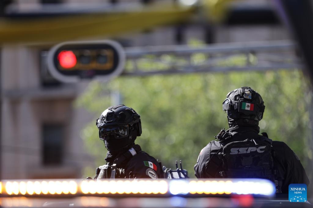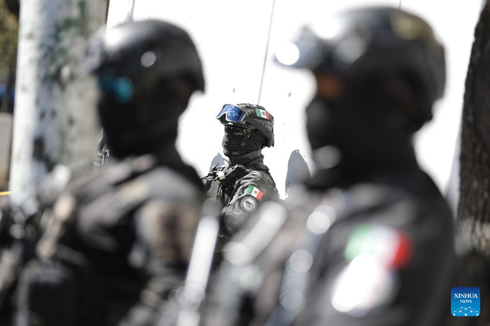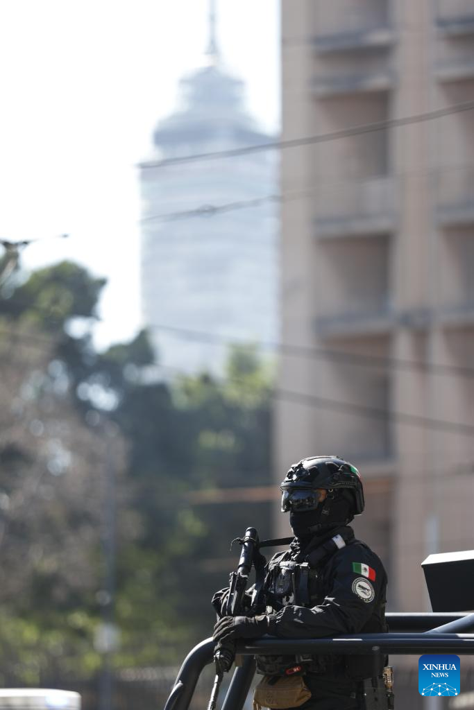 Security personnel guard on a street in Mexico City, Mexico, Feb. 23, 2026. (Photo by Francisco Canedo/Xinhua)