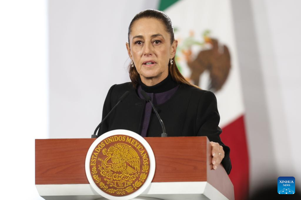 Mexican President Claudia Sheinbaum speaks at a press conference in Mexico City, Mexico, Feb. 23, 2026. (Photo by Francisco Canedo/Xinhua)