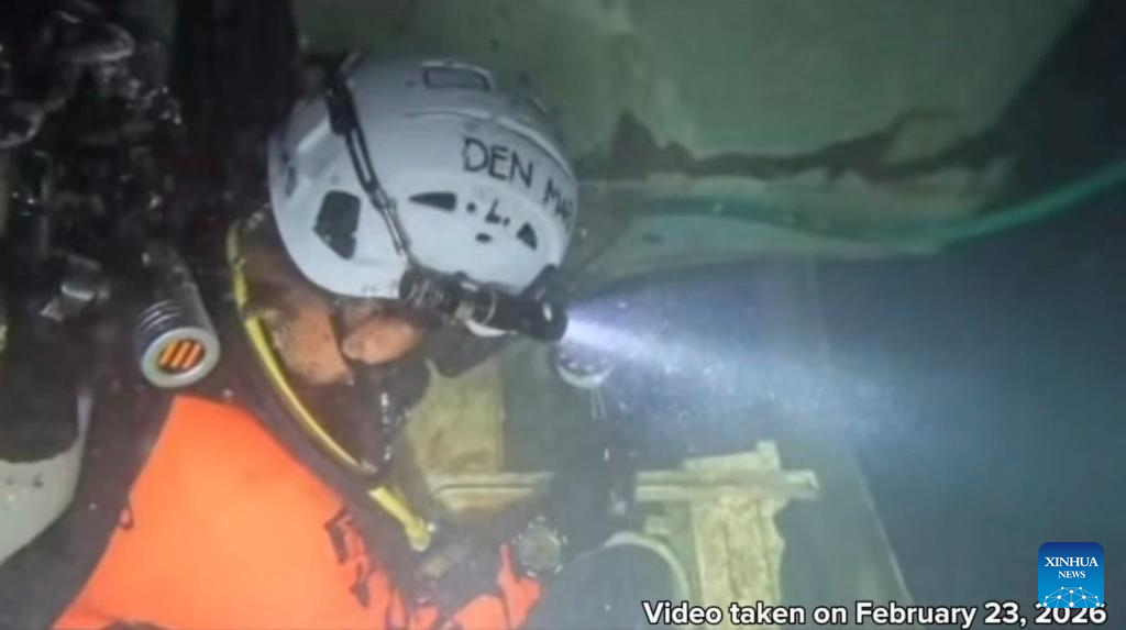 This screenshot shows a Philippine Coast Guard (PCG) diver working in waters near Baluk-Baluk Island in Basilan, the Philippines, Feb. 23, 2026. The PCG on Tuesday said it has completed a full underwater search of passenger ferry MV Trisha Kerstin 3, which sank off Basilan province on Jan. 26, leaving at least 65 people dead. (PCG/Handout via Xinhua)
