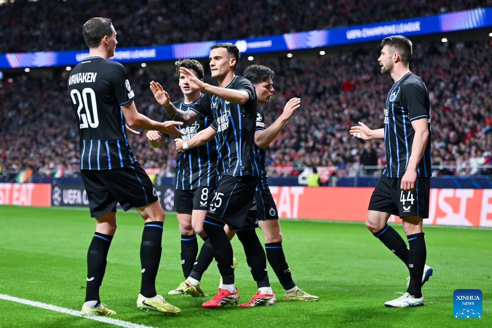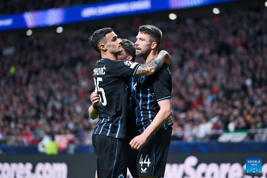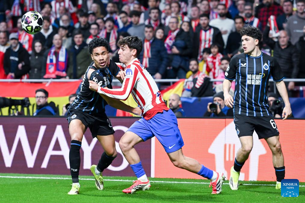 Players of Brugge celebrate a goal during the UEFA Champions League knockout play-off second leg match between Atletico de Madrid and Club Brugge in Madrid, Spain, on Feb. 24, 2026. (Photo by Gustavo Valiente/Xinhua)