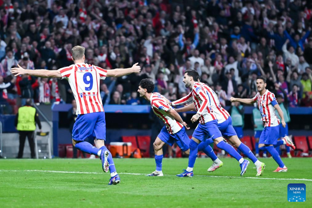 Players of Atletico de Madrid celebrate a goal during the UEFA Champions League knockout play-off second leg match between Atletico de Madrid and Club Brugge in Madrid, Spain, on Feb. 24, 2026. (Photo by Gustavo Valiente/Xinhua)