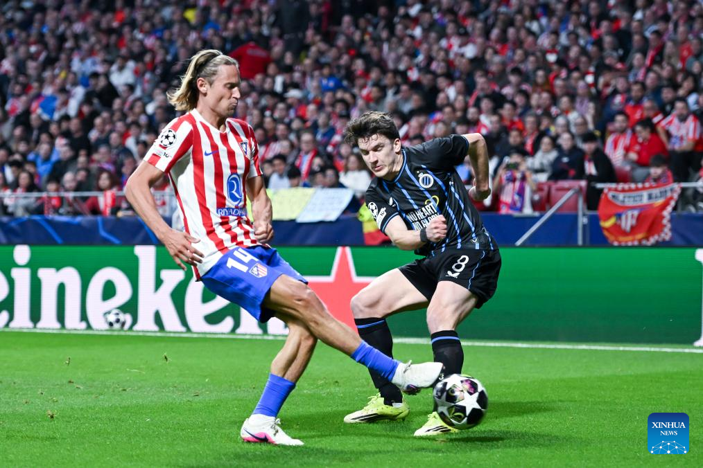 Joel Ordonez (1st L) of Brugge scores a goal during the UEFA Champions League knockout play-off second leg match between Atletico de Madrid and Club Brugge in Madrid, Spain, on Feb. 24, 2026. (Photo by Gustavo Valiente/Xinhua)