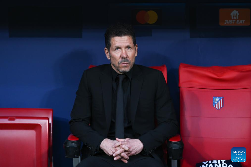 Head coach Diego Simeone of Atletico de Madrid reacts before the UEFA Champions League knockout play-off second leg match between Atletico de Madrid and Club Brugge in Madrid, Spain, on Feb. 24, 2026. (Photo by Gustavo Valiente/Xinhua)