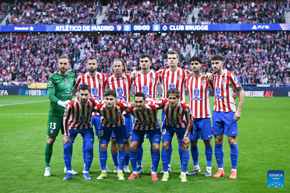 Starting players of Atletico de Madrid pose for photos before the UEFA Champions League knockout play-off second leg match between Atletico de Madrid and Club Brugge in Madrid, Spain, on Feb. 24, 2026. (Photo by Gustavo Valiente/Xinhua)