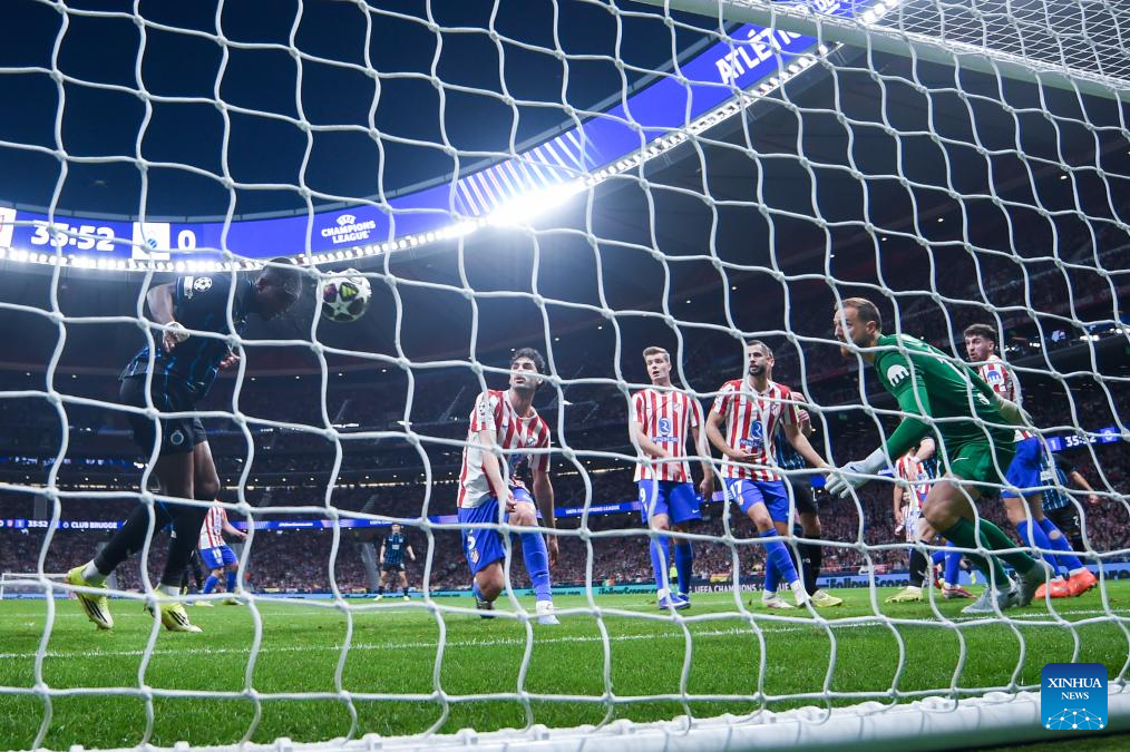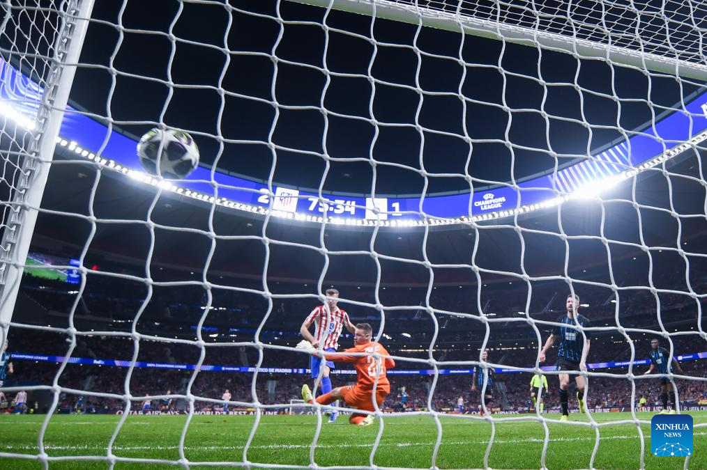 Alexander Sorloth (C) of Atletico de Madrid scores a goal during the UEFA Champions League knockout play-off second leg match between Atletico de Madrid and Club Brugge in Madrid, Spain, on Feb. 24, 2026. (Photo by Gustavo Valiente/Xinhua)